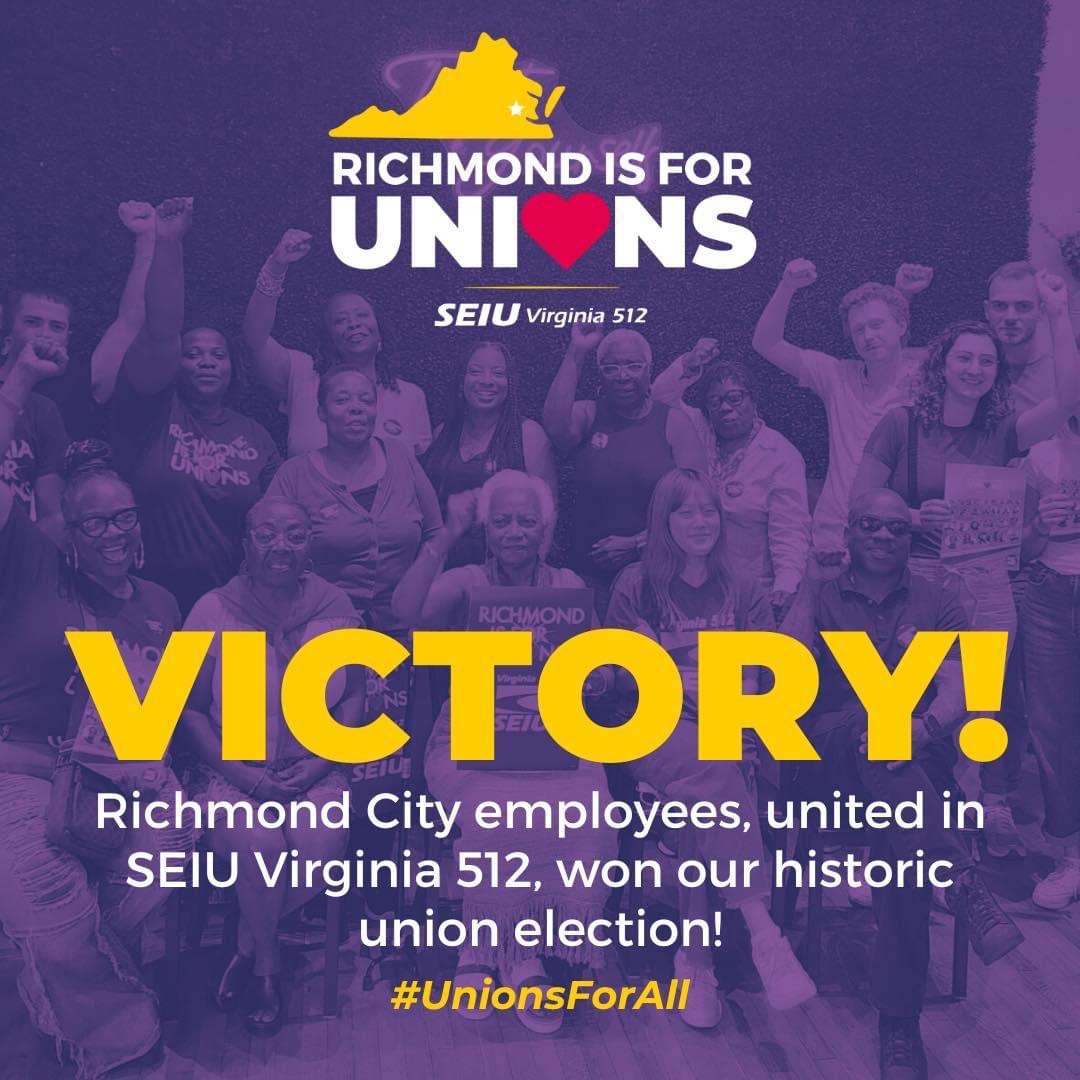 On June 22, 2023, the Administration and Technical employees of the City of Richmond voted with a margin of 20 to 1 in favor of uniting together in SEIU Virginia 512 to ensure that all employees have a meaningful voice on the job. 95 percent of voters voted yes for SEIU Virginia 512.